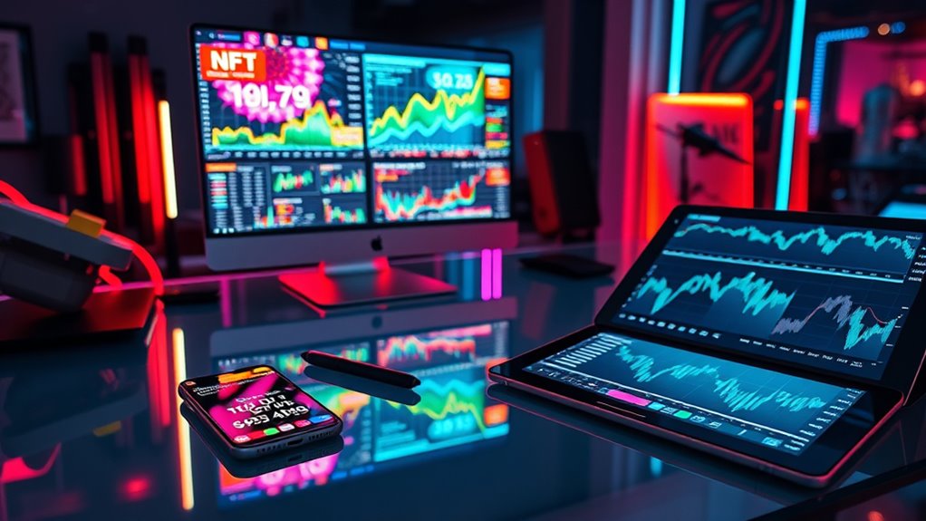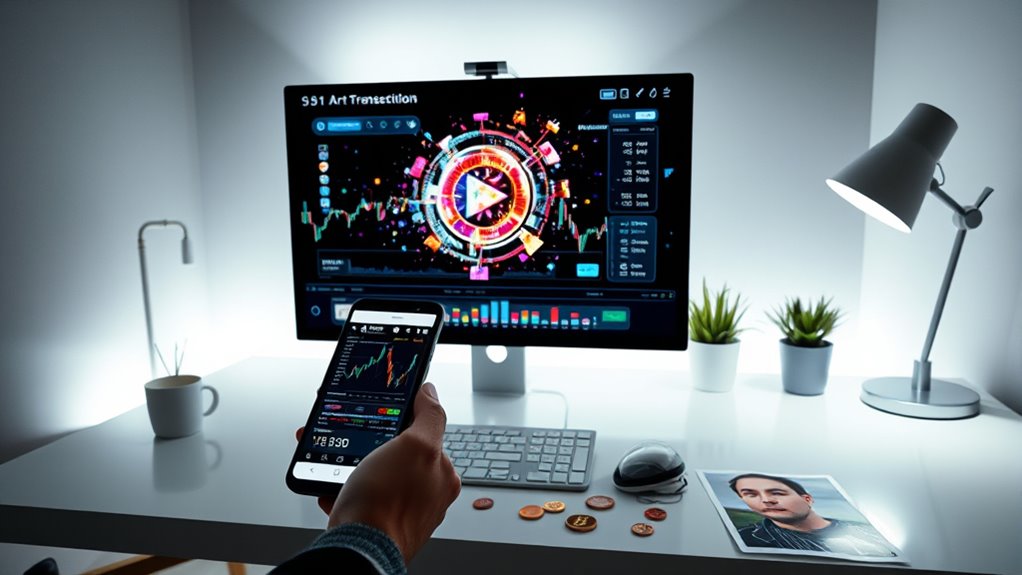 To profit from crypto assets like crypto art, you need to implement effective investment strategies that leverage market insights and technological tools. Technical analysis can help you spot patterns in Bitcoin art, with studies showing that 73% of major price moves are preceded by identifiable signals. Incorporating market analysis techniques can further refine your investment approach and improve decision-making. Using quantitative valuation models can boost your returns; investors applying data-driven methods often see 2.8 times higher risk-adjusted gains. Diversifying your portfolio by including crypto art offers unique benefits due to its distinct market behavior. Blockchain provenance enhances authenticity and value, reducing fraud risks. Choosing the right marketplaces, like OpenSea, is essential for optimizing revenue streams. Incorporating tokenized art funds and smart contracts can also increase liquidity and automate income, strengthening your investment approach.