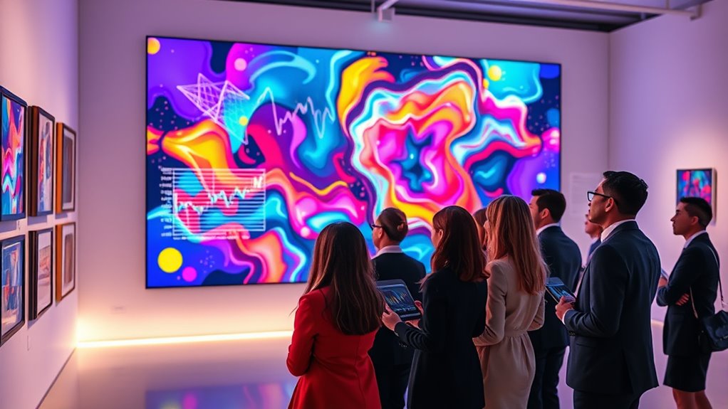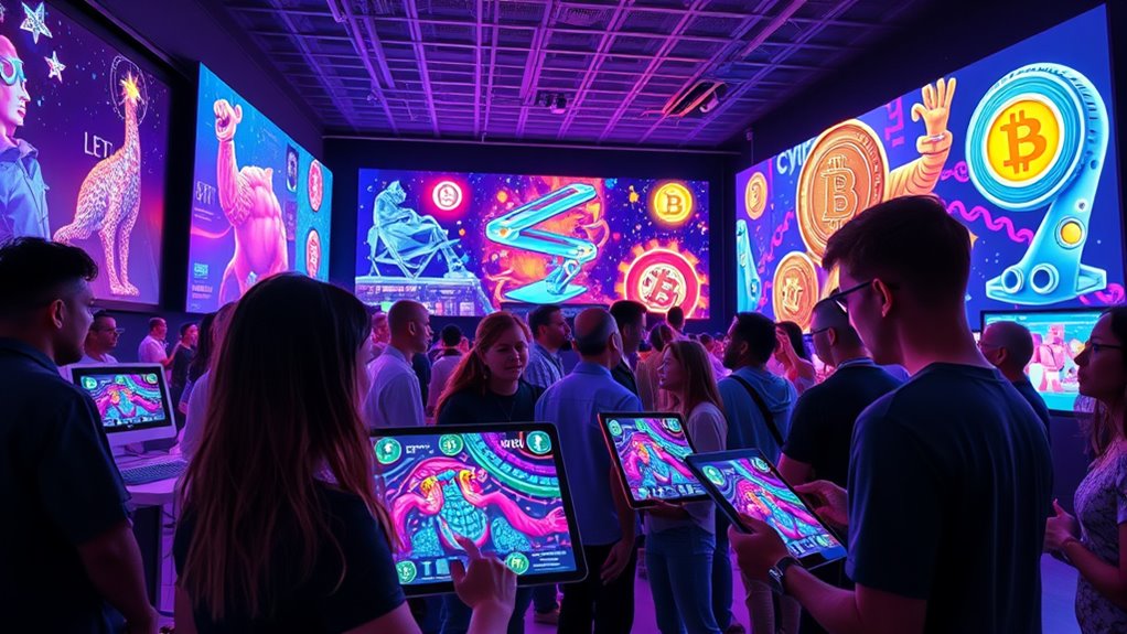 Emerging trends in crypto art reflect a dynamic shift toward innovation and sustainability. You’ll notice the NFT market has cooled since its 2021-2022 peak, with monthly trading volumes below $500 million, yet the sector continues transforming quietly. Artists increasingly use AI and machine learning to create innovative, generative works that push creative boundaries. Sustainability also takes center stage, with digital artists adopting eco-friendly practices to address environmental concerns. Integration into the metaverse offers immersive experiences, expanding how audiences engage with art. Blockchain authentication guarantees provenance and trust in transactions, while platforms democratize access, allowing anyone with an internet connection to participate. These innovations open new revenue streams, foster diversity, and boost global reach, shaping crypto art’s future while highlighting its cultural and technological significance. Additionally, the adoption of AI-driven personalization in digital art experiences enhances user engagement and personalization.