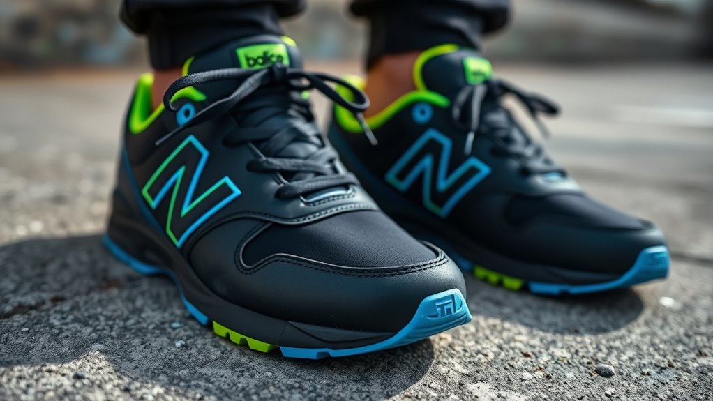 New Balance skate sneakers now feature a striking artistic makeover, blending bold designs with exceptional performance. These shoes combine durable materials for skatewear with creative aesthetics inspired by street art and culture. Pro skaters influence their designs, making them both stylish and functional. This shift challenges the brand’s ‘boring’ stereotype, appealing to skaters who want style without sacrificing performance. Keep exploring to discover how New Balance brings artistry and innovation to skateboarding footwear.