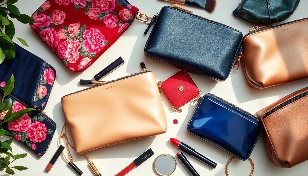 Size matters too. You’ll find small bags ranging from 5-10 cm for a minimalist approach, medium bags from 10-20 cm for regular use, and large options from 20-30 cm that can accommodate extensive collections. Think about how much makeup you typically carry; this will guide your choice effectively.