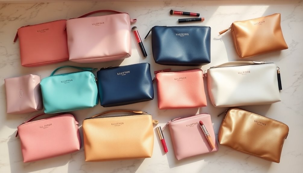 Size matters too. You’ll find small bags ranging from 5-10 cm for a minimalist approach, medium bags from 10-20 cm for regular use, and large options from 20-30 cm that can accommodate extensive collections. Think about how much makeup you typically carry; this will guide your choice effectively.