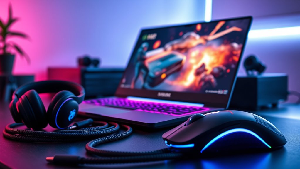 High-end gaming devices combine performance and design to create an incredible experience. They not only deliver powerful specs but also focus on aesthetics, offering customization options like RGB lighting. With advanced cooling systems, these devices prevent overheating and guarantee your hardware runs smoothly during intense sessions. This balance of efficiency and style elevates your gaming environment, making every session more immersive. Keep exploring to discover how these features enhance your gaming experience even further.