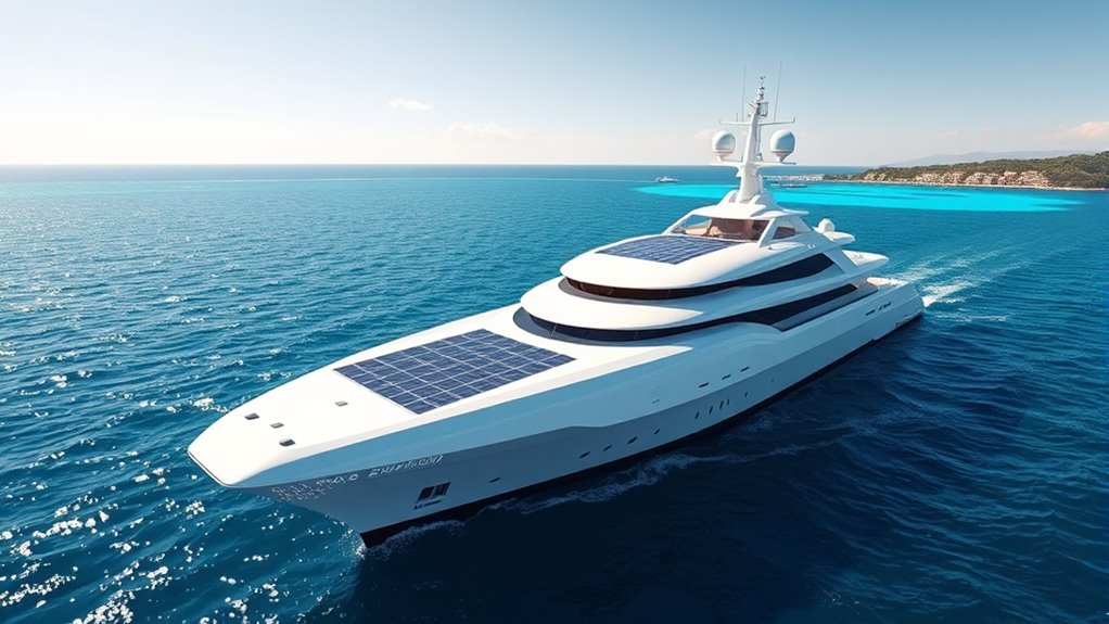 As luxury yachts push toward greater sustainability, solar-powered technology is transforming the superyacht experience. You no longer need to rely solely on traditional fuel sources to enjoy opulence at sea. Instead, advanced solar panel systems like Solar Skin 3.0 are pushing efficiency boundaries, providing you with cleaner, smarter energy solutions. These panels are tailored specifically for yachts, achieving the highest silicon solar cell efficiency currently available. Each panel acts as an intelligent unit, dynamically adjusting its electrical output to counteract shading from sails or superstructures. This means you get consistent power regardless of your vessel’s position or environmental conditions. Machine learning further enhances performance by analyzing operational data from yacht fleets worldwide, optimizing the layout and functioning of solar arrays in real time. This integration guarantees maximum energy capture in low-light and shaded environments, so you enjoy reliable power during your voyages. The durability of these photovoltaic cells is impressive—they withstand over 20,000 load cycles and operate reliably above 100°C, making them resilient against harsh marine conditions. Embedded RFID technology facilitates maintenance, allowing technicians to monitor and troubleshoot panels remotely, minimizing downtime. Moving beyond solar panels, your yacht’s energy storage system is equally advanced. Silent Yachts’ SY80, for example, features a formidable 522 kWh battery bank, which can be upgraded to 696 kWh, enabling extended journeys powered mainly by solar energy. These large-capacity batteries support longer cruising ranges without relying on traditional fuel, making it possible for you to travel farther with fewer emissions. When combined with solar arrays, the batteries enable silent, emission-free propulsion and reduce the need for generator use. Efficient energy management systems ensure solar input is balanced with onboard demands, maximizing range and reliability across diverse conditions. This results in a yacht that’s not only luxurious but also environmentally responsible. Solar-electric propulsion systems like Silent Yachts’ SY80 eliminate emissions entirely during operation, allowing for quiet, eco-friendly cruising. Fuel consumption drops considerably compared to conventional diesel engines, with voyages showing only about 3% generator runtime over nine days covering nearly 120 miles—demonstrating exceptional efficiency. Emerging technologies like fuel cells powered by methanol or ammonia further complement solar innovation, offering zero- or low-emission options for long-range journeys. Artificial intelligence plays a vital role in optimizing these systems. AI algorithms analyze real-time data to improve solar panel layout and performance, even in challenging conditions. Automated controls manage lighting, climate, entertainment, and security, boosting energy efficiency and onboard comfort. AI also personalizes system settings to match your preferences while maintaining sustainable energy use. Smart diagnostics, integrated with RFID, keep your solar panels in peak condition, reducing maintenance needs and ensuring consistent performance. In addition, recent advancements in solar cell efficiency have pushed the limits of photovoltaic technology, resulting in higher energy yields and better performance in marine environments. Moreover, innovations in marine solar integration are enabling seamless incorporation of solar power into complex yacht architectures. All these innovations converge to make your superyacht not just a symbol of luxury but a leader in sustainable marine technology, cutting fuel costs, lowering carbon footprints, and elevating your onboard experience.