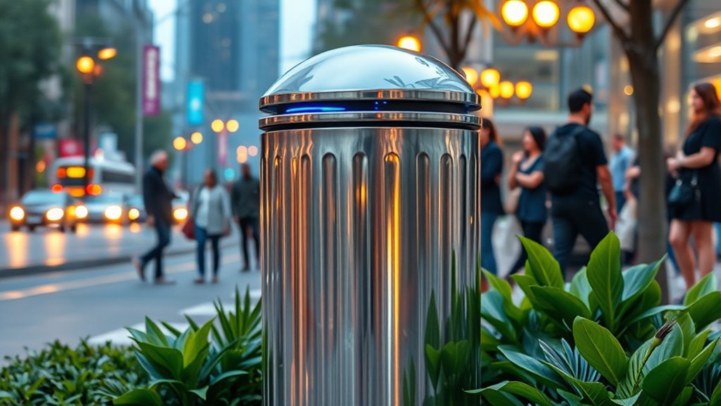 Self-cleaning dustbins are crafted from durable materials like stainless steel, high-density polyethylene, and reinforced plastics. You’ll notice their sleek design aesthetics, which blend functionality with modern looks. The stainless steel offers material durability, resisting rust and wear, while the plastics provide lightweight options that withstand harsh weather. You’ll appreciate how these materials not only enhance the dustbin’s appearance but also guarantee longevity, making them a practical choice for your waste management needs.