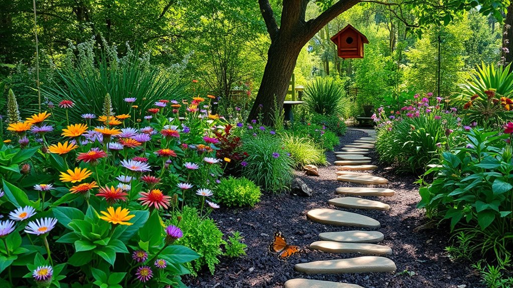 Sustainable landscaping turns your garden into a vibrant ecosystem that boosts biodiversity. By using native plants, you adapt to local climate and soil, requiring less water and maintenance. These plants provide essential habitat and food for local wildlife, like bees and butterflies, enhancing overall ecological balance. Incorporating features like rain gardens and permeable surfaces can further conserve water and reduce runoff. Keep exploring, and you’ll discover more ways to make your garden a sanctuary for nature.