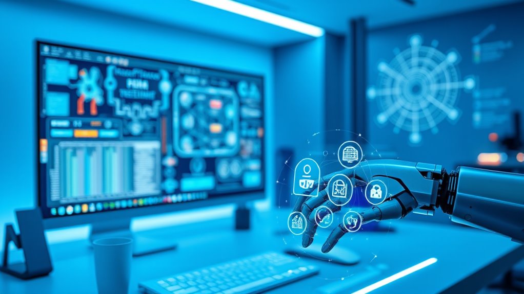 AI impacts job markets worldwide by creating new opportunities and transforming existing roles. You’ll notice demand for AI specialists rises, offering higher salaries, but some jobs, especially routine and knowledge-based ones, face displacement. As AI automates tasks in industries like manufacturing, healthcare, and finance, you may see shifts in employment patterns, with emerging roles in AI-driven sectors. Overall, AI fosters growth while challenging traditional job structures, requiring adaptability.