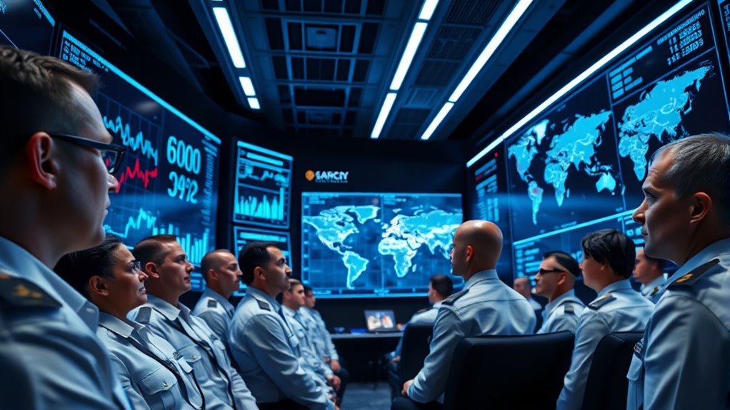 The Army now uses AI algorithms to modernize its promotion process, automating candidate screening and reducing human bias. These systems assess factors like education and job history, speeding up decisions and making them fairer by excluding personal details linked to inequality. Human reviewers still oversee the process to guarantee accuracy and fairness. As the system learns and improves, it helps identify top soldiers faster. Keep exploring to discover how this innovative approach is transforming military leadership development.