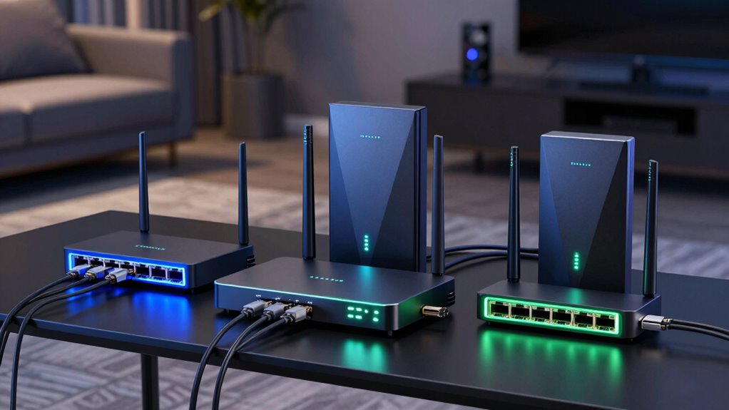 Choosing the right wired port options is vital to accessing the full potential of a 10GbE router in your home network. I recommend looking for multiple 10GbE ports to connect various devices, guaranteeing high-speed wired access across your setup. A combination of SFP+ and RJ45 ports is ideal, as it provides compatibility with both fiber and copper infrastructure. Additionally, consider routers with 2.5GbE, 1GbE, or higher-speed ports for greater flexibility. Link aggregation support is essential, as it allows you to combine multiple ports for increased bandwidth and redundancy. Finally, features like VLAN support and port management help optimize network performance and security. These port options ensure your network is scalable, reliable, and ready for future upgrades.