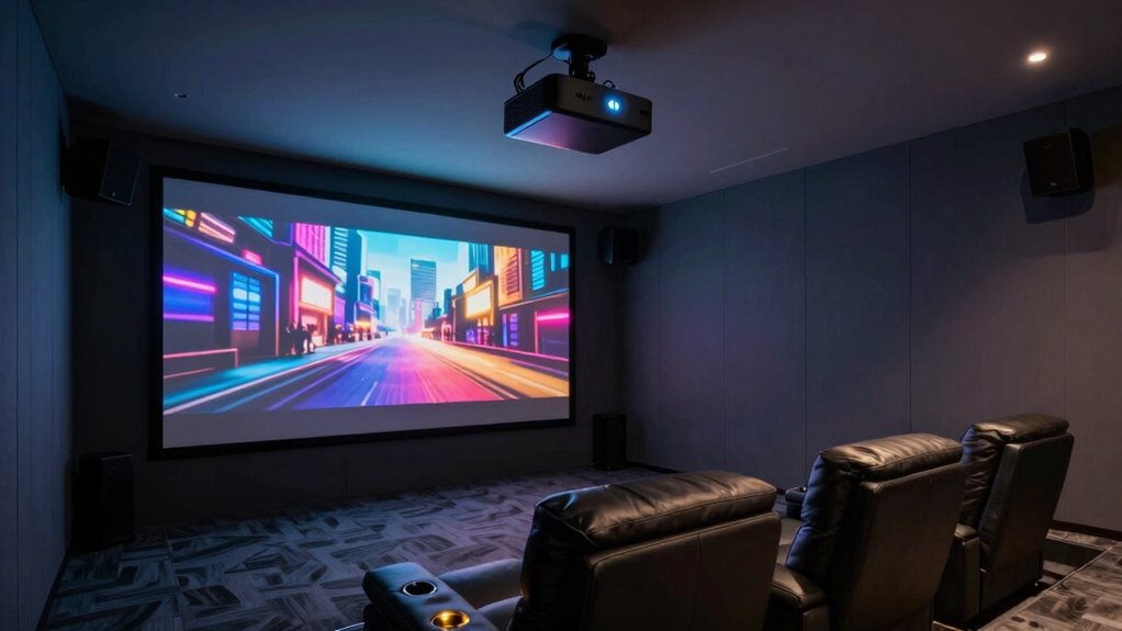 Choosing a 4K home theater projector means paying close attention to resolution and picture quality, as these factors directly influence your viewing experience. True 4K resolution (3840×2160 pixels) delivers four times the detail of Full HD, creating sharper, more immersive images. Native 4K projectors provide the best quality, but some models use pixel-shifting technology to simulate 4K on 1080p panels. HDR support, like HDR10+ and HLG, enhances contrast and color vibrancy, making images more lifelike. A higher color gamut, such as 98% DCI-P3, ensures richer, more accurate colors. Additionally, brightness levels impact clarity and vibrancy, especially in well-lit rooms. Prioritizing these aspects guarantees a stunning, detailed picture that elevates your home theater experience.
