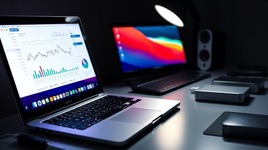 Ensuring your 4TB MacBook Pro seamlessly integrates with the Apple ecosystem is essential for maximizing productivity and minimizing technical hiccups. First, I check that the macOS version supports external drives and accessories, avoiding compatibility issues. Compatibility with Apple’s Continuity features like Handoff and Universal Clipboard makes workflows smoother when managing large storage options. It’s also important that the device has enough Thunderbolt 4/5 or USB-C ports to connect external 4TB drives and peripherals without needing adapters. Confirming external storage compatibility with Apple’s APFS file system guarantees peak performance and data security. Lastly, seamless integration with iCloud and other Apple services allows for effortless file sharing and backup management, ensuring my 4TB storage works harmoniously within the Apple ecosystem.