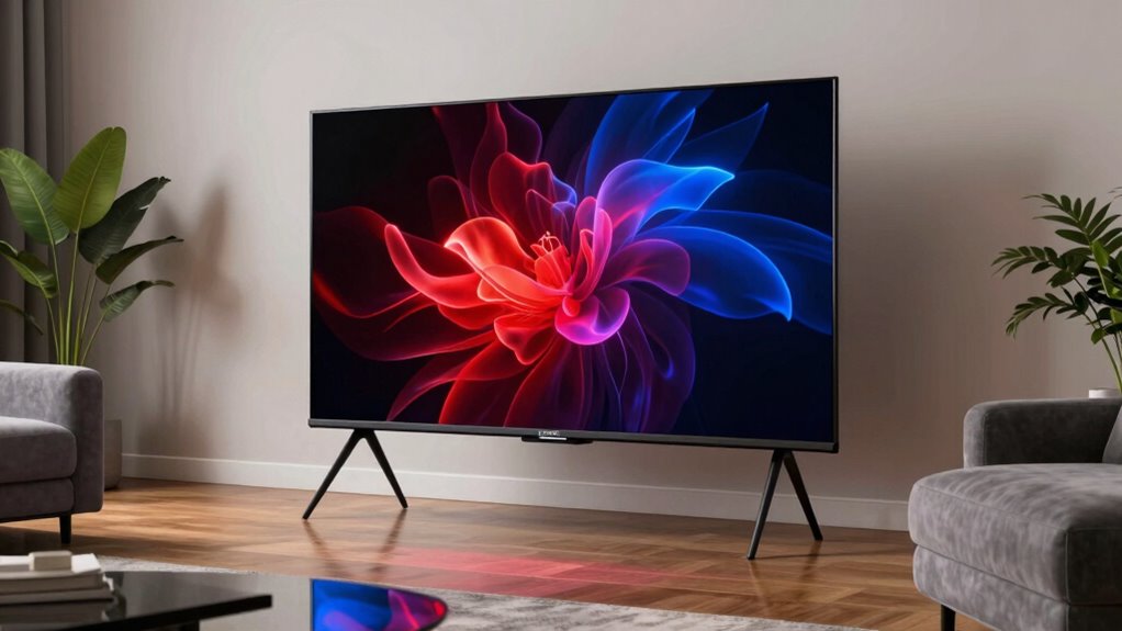 Choosing a 77-inch OLED TV that performs well in your room hinges largely on lighting conditions. In darker rooms, OLED’s high contrast ratios truly shine, delivering deep blacks and vibrant colors. However, in bright spaces with lots of ambient light, glare and reflections can diminish picture quality. To combat this, look for models with glare reduction features or anti-reflective coatings. A high peak brightness and anti-reflective screens help guarantee clear visuals even in well-lit environments. Additionally, a low UGR (Unified Glare Rating) of less than 22 indicates comfortable viewing without discomfort glare. Proper placement, along with adjustable lighting like dimmable lamps or curtains, can further improve your viewing experience by minimizing reflections and enhancing contrast.
