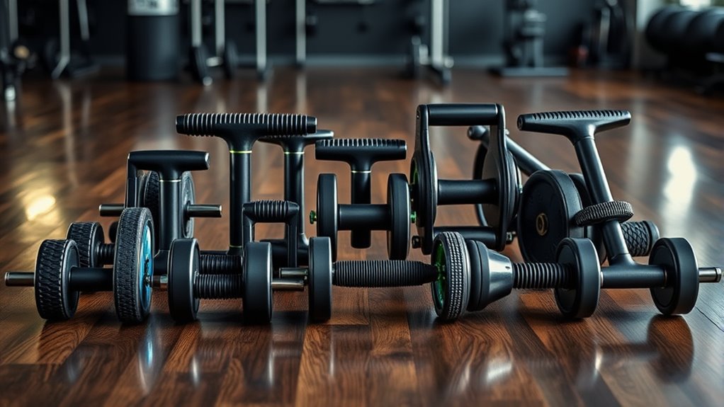 Choosing an ab roller with strong stability and balance features is essential for safe and effective workouts. A wider wheel surface, around 2 to 3.2 inches, offers better stability and minimizes wobbling during exercises. Dual-wheel designs provide extra support, especially on uneven surfaces, helping maintain balance. Non-slip materials on the wheel and handles improve grip, reducing the risk of slips that could lead to injury. Features like a low center of gravity and even weight distribution enhance balance during dynamic movements. Ergonomic handles and textured surfaces help keep proper alignment and prevent tipping or shifting. Prioritizing these features ensures your workout remains stable, safe, and effective, allowing you to focus on engaging your core without worry about losing control.