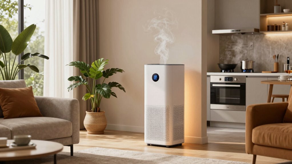 Ever wondered how much clean air you need? For effective cooking odor removal in large rooms, I recommend an air purifier with a CADR rating of at least 300 for smoke and odors. This guarantees it can handle the volume and intensity of cooking smells. Higher ratings mean faster, more efficient odor elimination. Trust me, choosing a purifier with the right CADR makes a noticeable difference in keeping your space fresh.
