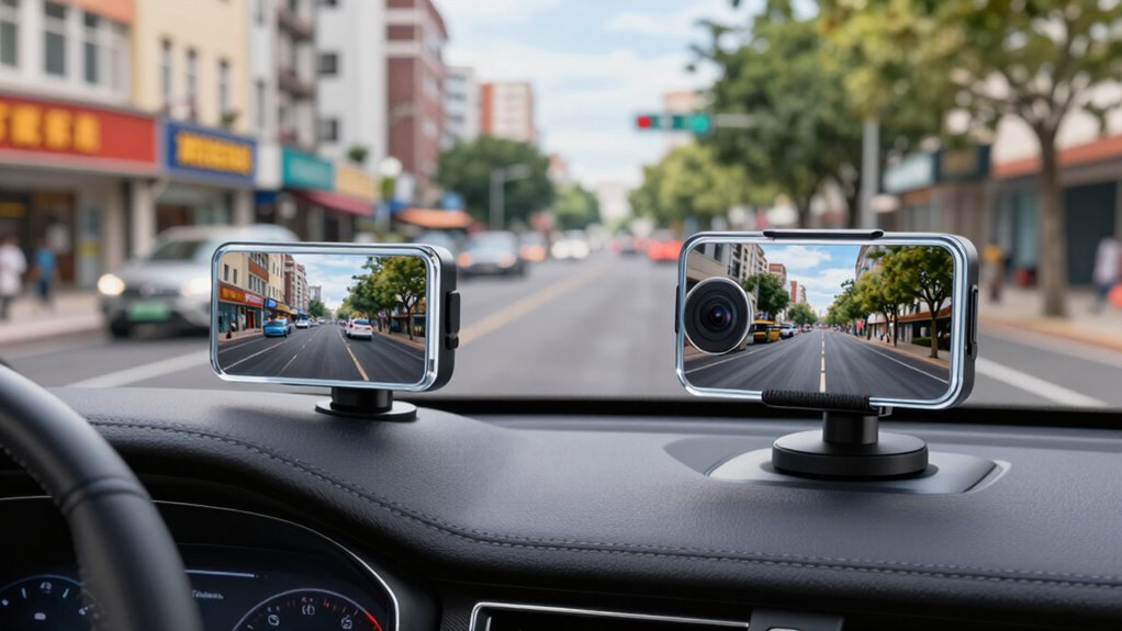 When evaluating the storage capacity of a dash cam, it’s just as important to take into account its connectivity features to guarantee smooth operation and easy access to footage. A good dash cam should have dual-band WiFi (5GHz and 2.4GHz) for faster, more stable wireless connections and seamless video transfers. Compatibility with both iOS and Android apps is essential for remote control, live streaming, and quick downloads. I also look for models supporting real-time GPS data logging, which overlays location, speed, and routes onto videos, adding valuable context. WiFi-enabled firmware updates are a plus, making it simple to keep the device current without manual hardware tweaks. Finally, built-in WiFi modules enable instant sharing and management of footage directly from the dash cam to your smartphone, simplifying the user experience.
