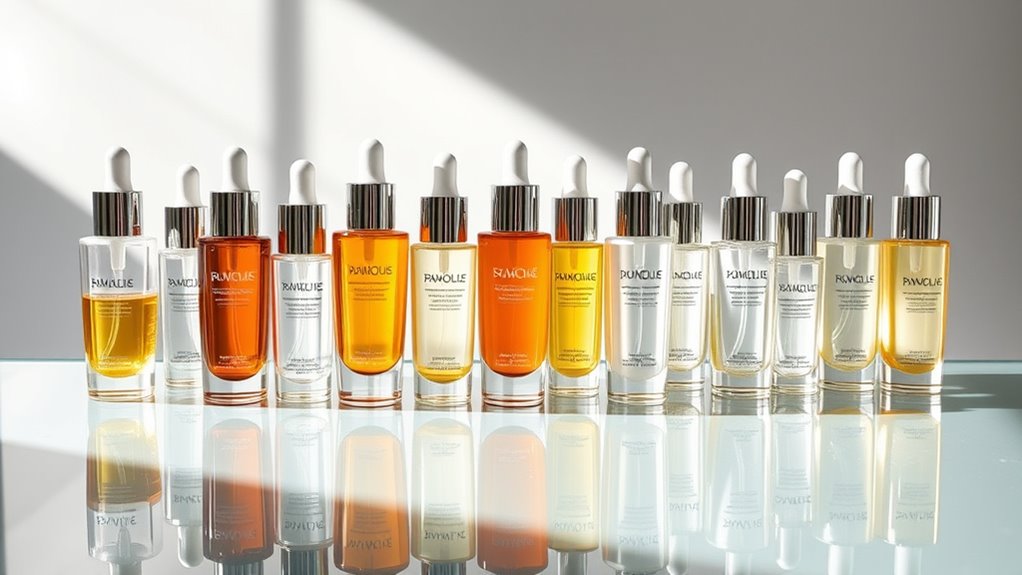 Choosing the right anti-aging serum depends heavily on your skin type, as different formulations cater to specific needs. If you have oily or acne-prone skin, opt for lightweight, oil-free, non-comedogenic serums that won’t clog pores or cause breakouts. Sensitive skin benefits from serums free of fragrances, alcohol, and harsh chemicals, reducing irritation and redness. For dry or dehydrated skin, look for products with humectants like hyaluronic acid or glycerin that boost moisture retention and improve elasticity. If your skin shows signs of aging, select serums with targeted active ingredients like peptides or retinol, designed to address wrinkles and firmness without causing excessive dryness. Matching your serum to your skin type ensures better results and a more comfortable, effective skincare routine.