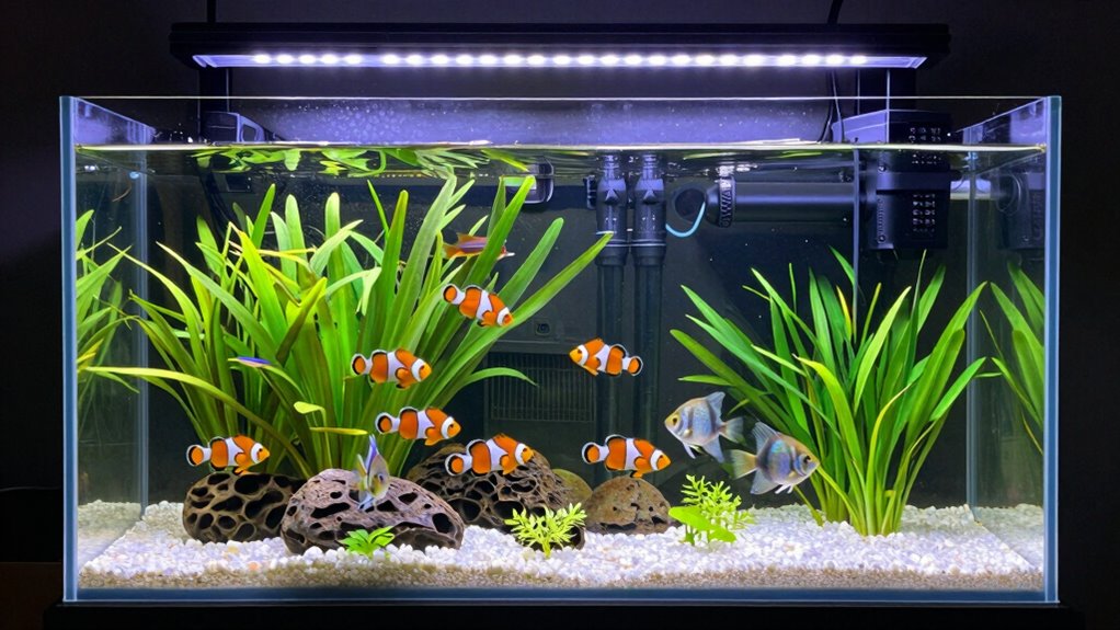Lighting options in a 55-gallon aquarium starter kit play a crucial role in setting the right environment for your fish and plants. LED lighting is common, offering energy-efficient white lights that mimic natural sunlight, promoting healthy plant growth and vibrant colors. Adjustable LEDs allow you to customize the brightness and create shimmer effects, enhancing the visual appeal of your aquarium. Some kits feature hinged hoods with integrated LEDs, making maintenance easier without sacrificing light quality. When choosing lighting, consider the intensity and spectrum, as these influence plant health and overall ambiance. It’s also important to think about energy consumption and how long you’ll keep the lights on daily. Selecting the right lighting ensures your aquarium looks stunning while supporting a healthy aquatic ecosystem.