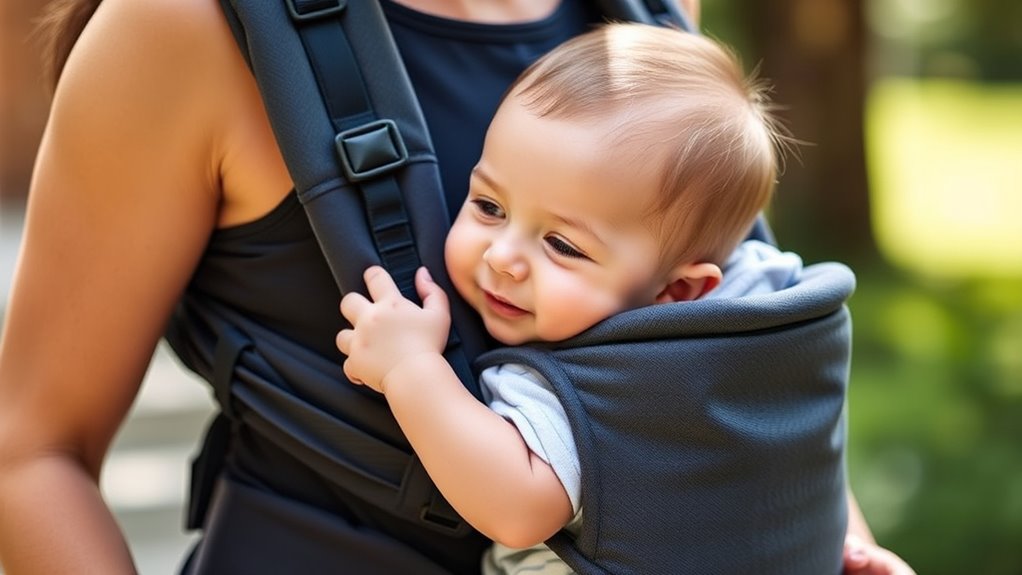 Ease of use and setup are crucial factors to contemplate because a carrier that’s quick to put on and take off can save time and reduce frustration. Look for carriers with adjustable straps and buckles that allow for easy donning without help. Intuitive design features, like color-coded or labeled adjustment points, make it simple to achieve a proper fit quickly. Clear, step-by-step instructions or visual guides are especially helpful for first-time parents. Lightweight carriers that can be assembled or adjusted in just a few minutes add convenience during errands or travel. Features like one-click buckles or minimal components also simplify setup, ensuring you can secure your baby safely without hassle. The easier it is to use, the more likely you’ll enjoy the carrier daily.