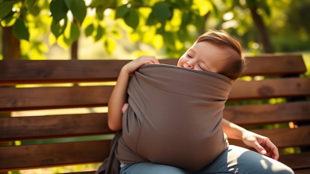 When choosing a carrier for different climates or seasons, I look for breathable fabrics like mesh or linen for hot weather, which keep both of us cool and comfortable. In colder months, I prefer carriers with insulated linings or thicker fabrics to keep my baby warm. I also consider UV protection and easy layering options. Selecting the right carrier helps guarantee comfort and safety no matter the season.