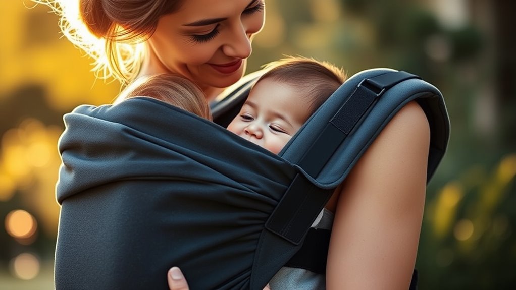 To guarantee proper weight distribution for comfort, I always make sure the carrier is snug and that my baby’s weight is centered against my body. I adjust the straps so they’re not too tight or loose, keeping the load balanced across my hips and shoulders. I also switch sides regularly to avoid strain. This way, I stay comfortable and my little one stays secure and close.