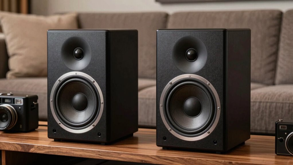 Ensuring your bookshelf speakers fit perfectly in your space is essential for ideal sound and aesthetics. First, measure your room to confirm the speakers will fit comfortably without overcrowding. Pay attention to their dimensions—height, width, and depth—and match them to your designated placement area. Smaller speakers might suit limited spaces but often sacrifice bass response, so find a balance that meets your sound needs. Make sure there’s enough space around the speakers for proper sound dispersion and to avoid acoustic obstructions. Also, consider the height and positioning, ensuring they’re aligned with your ear level for the best listening experience. Proper sizing not only enhances sound quality but also keeps your space balanced and visually appealing.
