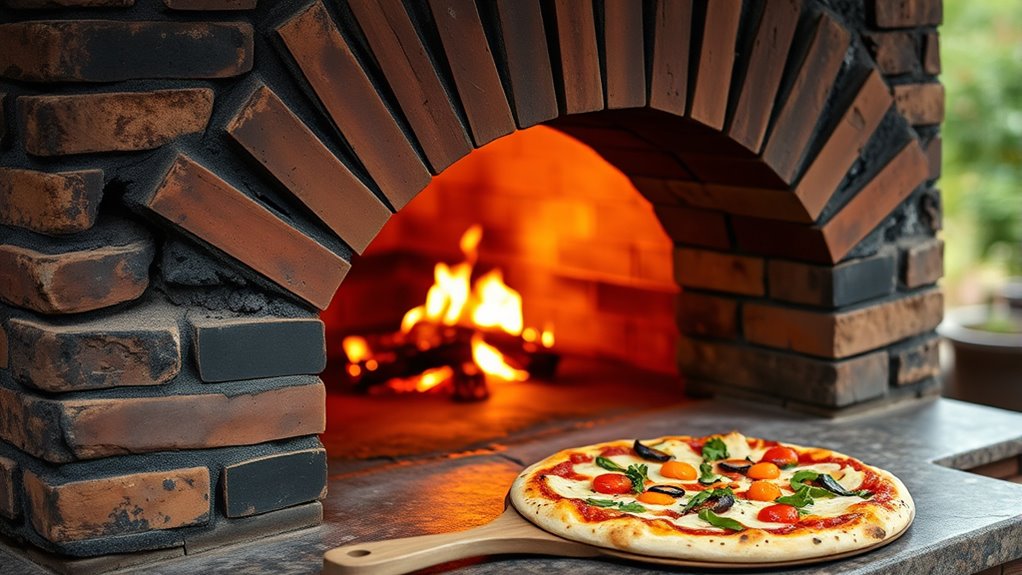 The materials used in building brick pizza ovens directly affect their performance, durability, and food safety. Food-grade fire bricks made of high-density clay can withstand temperatures up to 3000°F, ensuring both safety and longevity. Refractory bricks provide excellent thermal insulation and heat retention, helping maintain consistent cooking temperatures essential for authentic pizza. These materials are resistant to cracking and spalling under high heat, extending the oven’s lifespan. Food-safe fire bricks are designed for direct contact with food, preventing any harmful chemical leaching. The choice of construction materials influences how quickly and evenly the oven reaches high temperatures, which is critical for proper cooking. Selecting high-quality, durable, and food-safe materials guarantees a reliable, long-lasting brick oven that delivers perfect results every time.