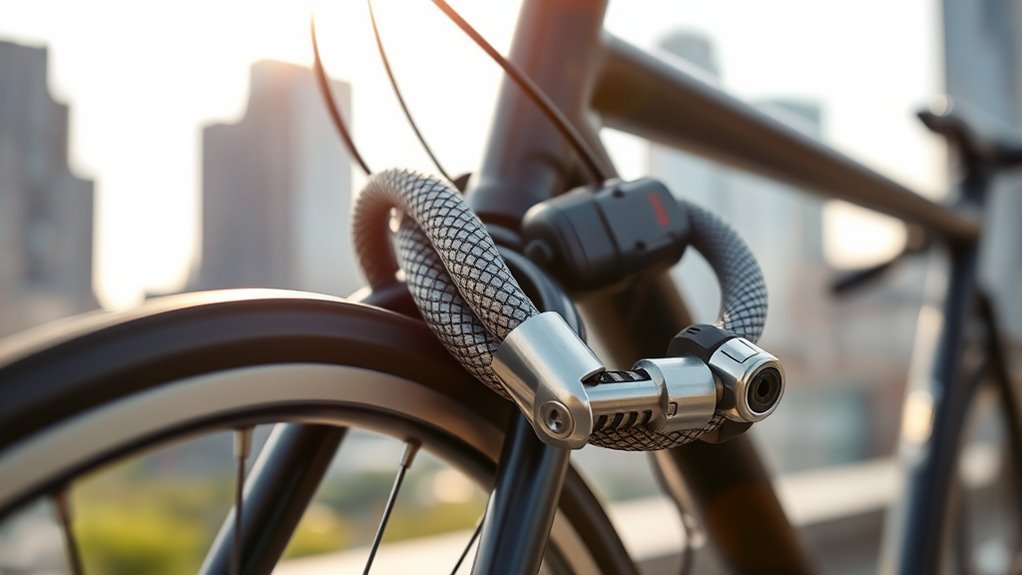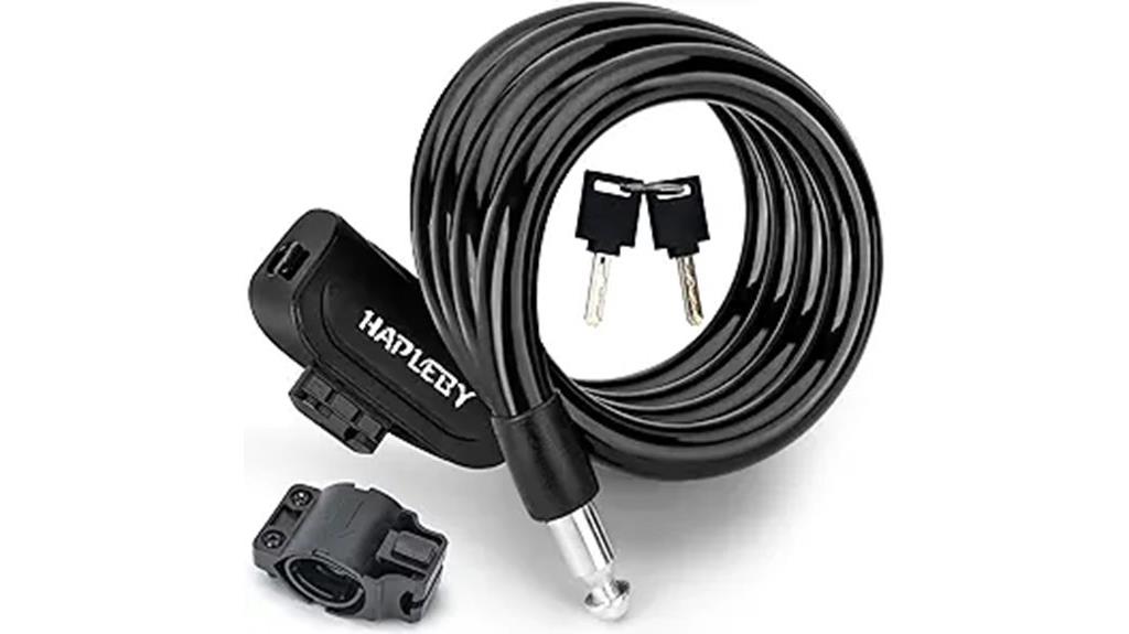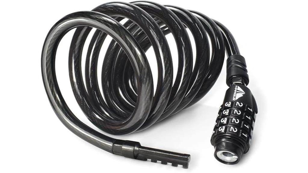 Choosing the right cable lock often comes down to how portable and easy to store it is. A lightweight lock with a compact design is a game-changer, especially if you’re frequently on the move or traveling. Flexible, coiled cables fit easily in pockets, backpacks, or wrapped around bike frames, making them highly convenient. Some locks come with mounting brackets or clips, allowing you to carry them hands-free and reducing the risk of losing them. Longer cables offer more versatility but need extra storage space, so finding the right length balances convenience and security. Weather-resistant coatings and durable materials guarantee the lock stays intact during transport and in outdoor conditions, giving you peace of mind wherever you go.