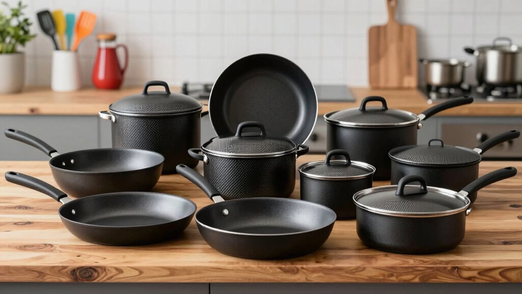 When selecting a carbon steel cookware set, I consider factors like durability, heat responsiveness, and size options to fit my cooking needs. It’s also important to guarantee compatibility with my stove and understand the maintenance involved, including seasoning. These points help me choose a set that’s reliable, efficient, and easy to care for.