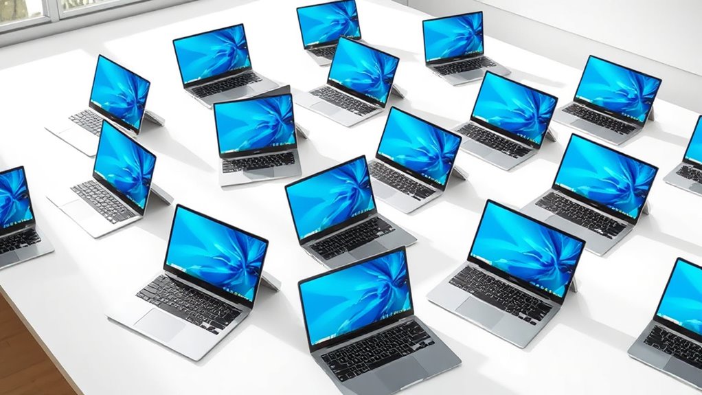 Ever wondered what makes a Chromebook truly portable? It’s primarily about weight, thickness, and durability. A lightweight Chromebook, under 3 pounds, is effortless to carry around daily or during travel. Slim profiles, often less than 0.75 inches thick, fit snugly into backpacks or briefcases, enhancing portability. Durable materials like reinforced plastics or MIL-STD 810H standards guarantee the device withstands bumps and knocks in on-the-go environments. Compact dimensions make it easier to use in tight spaces like coffee shops, classrooms, or on planes. Additionally, a long-lasting battery—ranging from 10 to 14 hours—supports extended work sessions without frequent recharges. When choosing a Chromebook, focus on build quality and portability features that align with your mobile lifestyle.