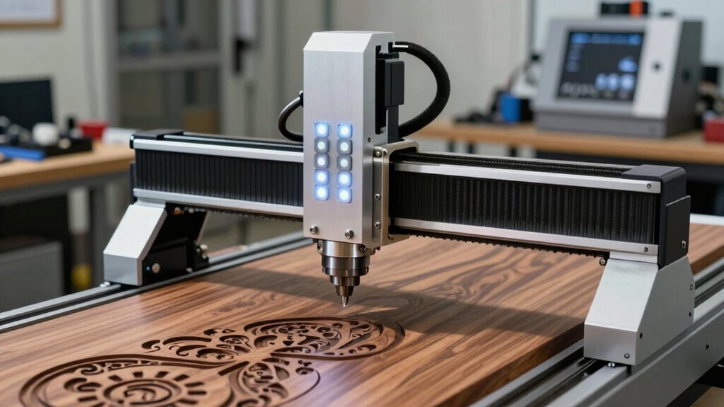 Selecting a CNC router with adequate power and spindle speed is essential for achieving clean, precise cuts in wood. A higher spindle power, like 500W or more, lets you cut and engrave thicker or denser woods efficiently. Spindle speeds between 10,000 and 13,000 RPM ensure smooth finishes and detailed carvings across various wood types. Variable spindle speed control adds flexibility, allowing you to adjust cutting intensity based on the wood’s hardness and project needs. Having enough power and speed reduces tool wear, improves cut quality, and enhances machining accuracy. Additionally, compatibility with different spindle adapters and the option to upgrade spindle motors can boost the machine’s versatility for a wide range of woodworking applications.