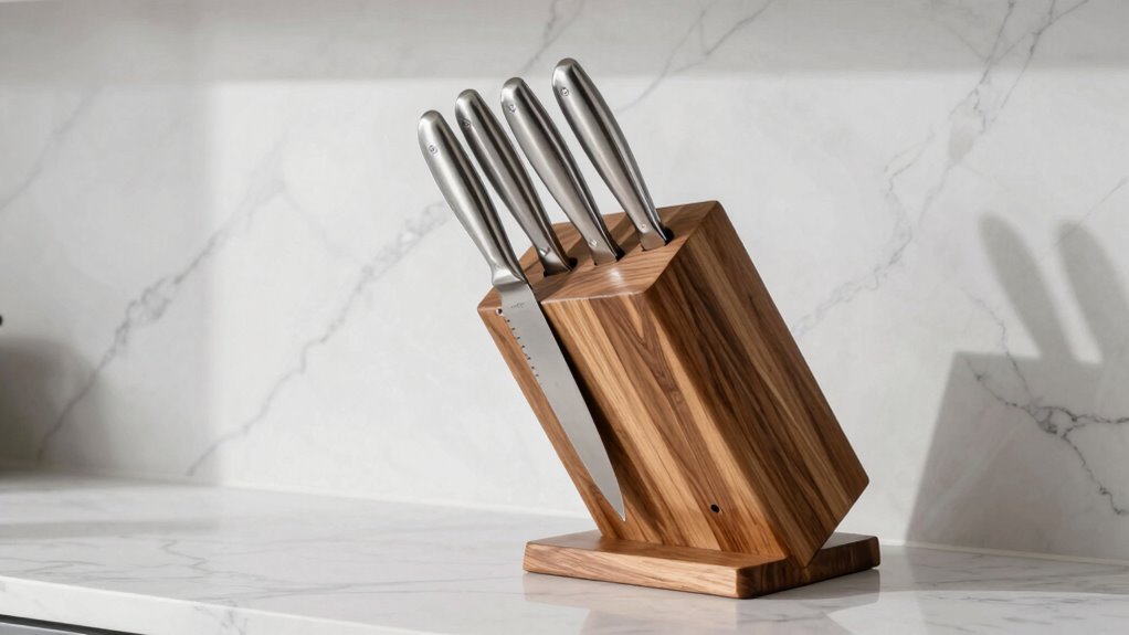 Choosing the right countertop knife holder is like finding a trusted guardian for your culinary tools. With options that blend style and function, you can keep your knives safe and your countertop beautiful. Imagine a sleek holder as the anchor of your kitchen’s chaos, turning clutter into harmony. So, pick one that speaks to your space and needs, and let your knives rest peacefully, ready to inspire your next delicious creation.