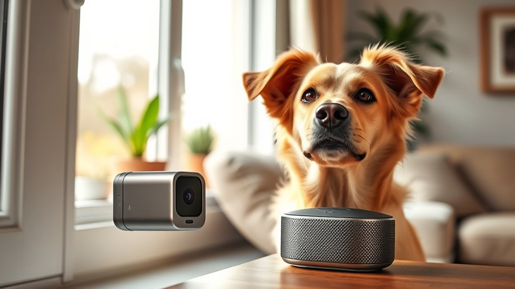 Ever wonder how much calmer your dog feels when you can talk to them directly through their camera? Two-way communication is a game-changer, letting you speak and listen to your pet from anywhere. To make this effective, look for cameras with high-quality microphones and speakers for clear audio. This feature isn’t just about convenience—it helps soothe anxious dogs or correct behavior with verbal commands. Some cameras even offer adjustable volume controls, so you can tailor the sound to your pet’s comfort level. Noise reduction and echo cancellation are also important, ensuring your voice comes through crisp and clear without distracting background noise. Overall, two-way communication keeps you connected, easing your dog’s stress and strengthening your bond, even when you’re apart.