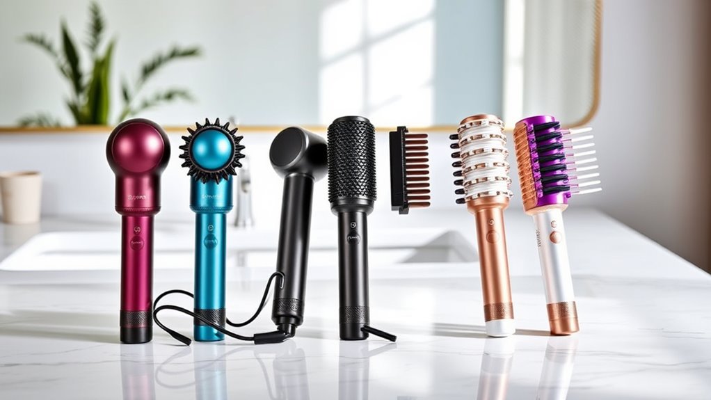 To get the most out of a Dyson Airwrap alternative, I look for a multi-functional device that can handle various styling needs with ease. I prefer tools with a wide range of attachments—curlers, brushes, nozzles—that let me create different hairstyles without switching devices. Adjustable heat and airflow settings are essential, so I can customize each style and protect my hair. I also check if the device offers bidirectional curl modes or automatic curling features for diverse curl patterns. Interchangeable attachments that allow curling, straightening, volumizing, and smoothing save space and make styling more efficient. Lastly, having accessories like diffusers and concentrators makes it possible to achieve professional-looking results with just one versatile system.