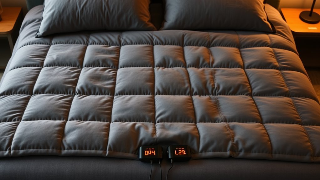 Auto-shutoff features are essential for ensuring your electric blanket remains safe and energy-efficient. They automatically turn off the blanket after a set period, typically between 1 and 12 hours, which helps prevent overheating and reduces fire risks. I find adjustable timers particularly helpful because they let me customize how long the blanket stays on, balancing comfort with safety. This feature is especially important if you plan to use the blanket overnight or if someone in your household has limited mobility. Regularly checking that the auto-shutoff works properly is a good habit, ensuring the blanket’s safety and longevity. Ultimately, a reliable auto-shutoff feature gives peace of mind, so you can enjoy cozy nights without worry.