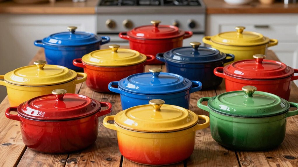 When choosing an enameled cast iron Dutch oven, I consider factors like size and capacity to match my cooking needs, as well as the material’s durability for long-term use. I pay attention to how evenly it distributes heat and the lid’s design features that lock in moisture. Finally, I look at color and style options to guarantee it complements my kitchen aesthetic.