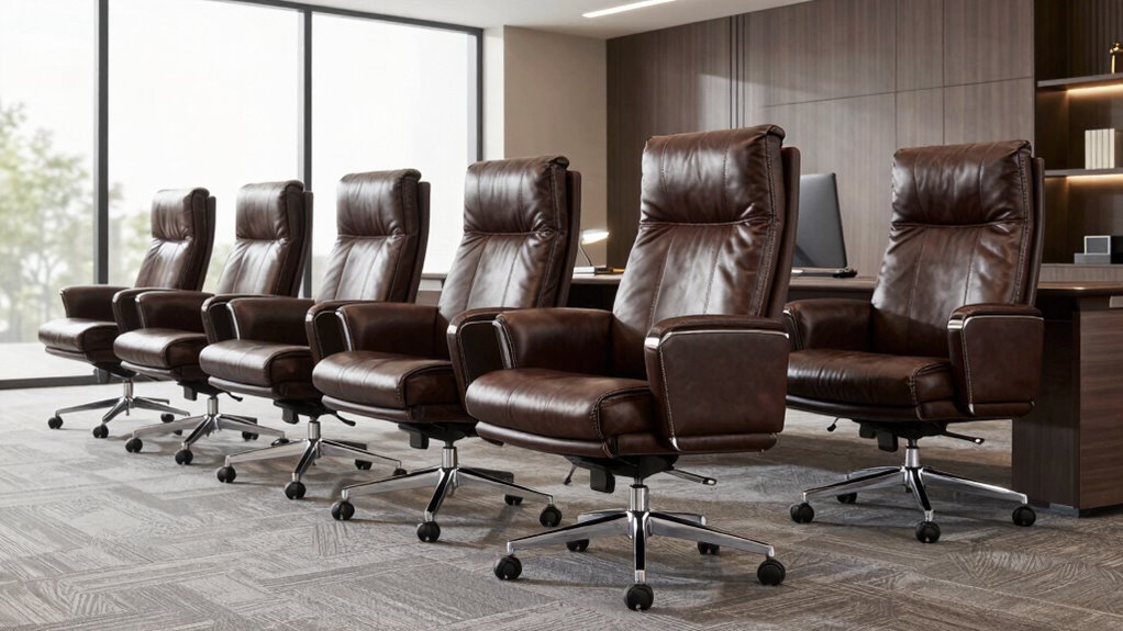 Choosing a high-quality executive office chair with real leather means paying close attention to material durability. Genuine leather is generally more resistant to wear, scratches, and tearing than bonded or faux alternatives, making it ideal for long-term use. The tanning process, whether vegetable or chrome, enhances leather’s strength and lifespan. Thicker leather with a tight grain offers better resistance to cracking and damage over time. Proper maintenance, including regular cleaning and conditioning, is vital to preserve its look and durability. Certified leather, marked by standards like SGS, guarantees the material meets strict quality, safety, and environmental criteria. Investing in high-quality, well-maintained leather ensures your chair remains durable, attractive, and functional for years to come.