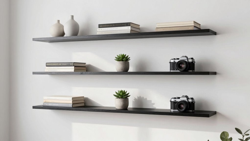 When selecting heavy-duty long floating shelves, considering their aesthetic style is essential to achieving the desired look in your space. I look at options like rustic, modern, farmhouse, industrial, and minimalist designs to match my decor. The finish plays a big role—natural wood grain, painted, stained, or black finishes can dramatically change the vibe. Decorative touches like distressed textures or sleek surfaces add visual interest. The shape and profile, whether rectangular or rounded, help create a cohesive style. Additionally, the hardware—hidden brackets for a clean look or visible supports for an industrial feel—complements the overall aesthetic. Choosing a style that aligns with your decor guarantees your shelves enhance your space rather than clash with it.