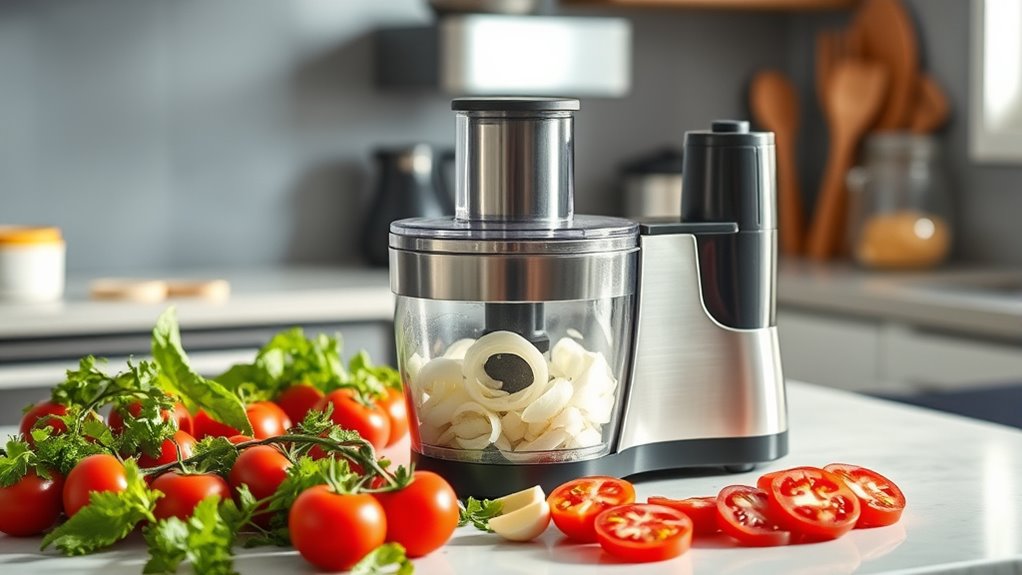 Food processors come in a range of bowl sizes, from compact 3-4 cup models perfect for quick, small tasks, to large 12-16 cup units designed for family-sized meals and bulk prep. Smaller models are great for chopping herbs, nuts, or making single servings, while larger ones handle bigger batches like dough or shredded vegetables. Keep in mind that larger bowls tend to have a bigger footprint, which can be a concern if your kitchen space is limited. Some processors include multiple bowls of different sizes, letting you prepare multiple ingredients simultaneously without flavor transfer. When choosing the right size, think about your typical meal portions, how often you cook, and your storage options. Picking the right capacity guarantees efficiency without cluttering your kitchen.