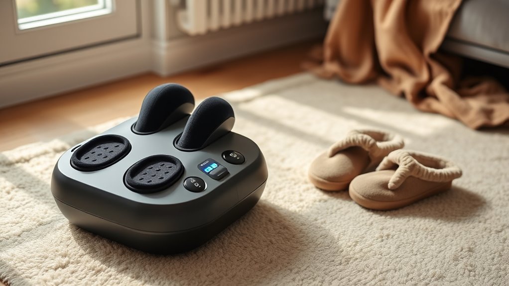 Heat therapy is a key feature to contemplate because it considerably enhances the soothing effects of a foot massager by promoting better blood flow and muscle relaxation. Most devices offer temperatures between 104°F and 131°F, which are ideal for therapeutic warmth. Adjustable heat settings let you customize comfort and target specific areas, ensuring a personalized experience. Rapid heating functions can warm your feet within just 5 to 10 minutes, making relief quick and convenient. Some massagers include automatic temperature regulation, preventing overheating and maintaining safe, consistent warmth. Incorporating heat can alleviate conditions like plantar fasciitis, neuropathy, and general foot fatigue. Overall, heat therapy options add significant value by intensifying relaxation and promoting faster recovery, making them an essential consideration when choosing a foot massager.