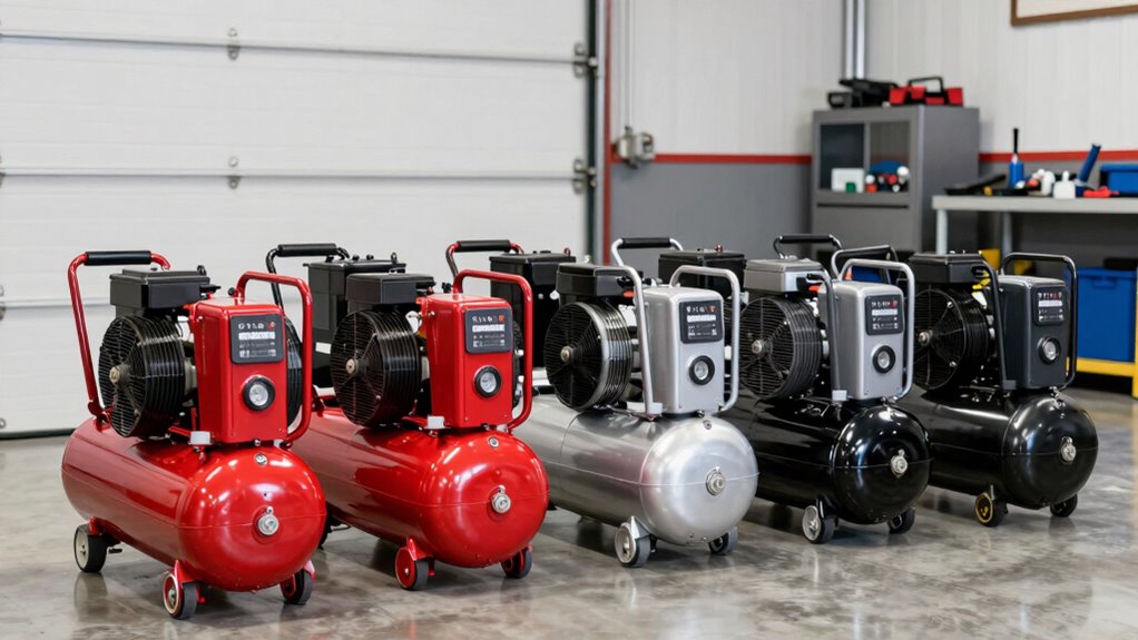 Selecting the right tank size is essential for guaranteeing your garage compressor meets your workflow demands. Larger tanks, like 20 gallons or more, provide longer continuous operation and reduce the need for frequent recharging, making them ideal for extensive projects. Smaller tanks, such as 6 or 8 gallons, are more portable but may require more frequent breaks to refill, which can slow down your work. If you use high-demand pneumatic tools or operate multiple tools simultaneously, a tank of at least 13 gallons is recommended to maintain consistent performance and prevent cycling issues. Ultimately, balancing tank size with your need for portability and runtime ensures you choose a compressor that fits your garage tasks efficiently without unnecessary interruptions or bulk.