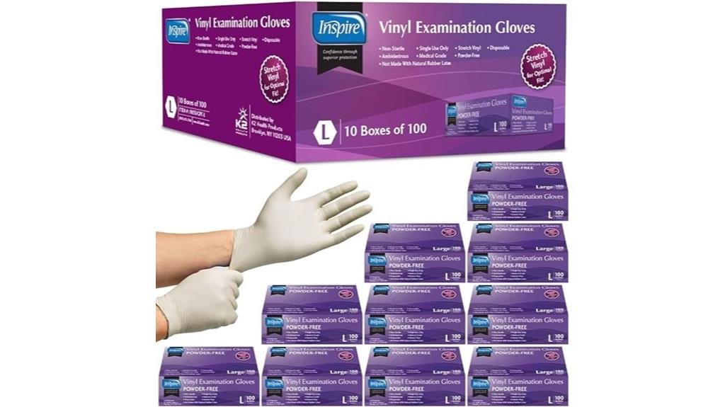When I need reliable, latex-free disposable gloves for various tasks, Inspire Exam Vinyl Gloves stand out as a top choice. They’re versatile, perfect for cleaning, food prep, or handling chemicals, and provide solid protection without tearing. Made from sturdy vinyl, these gloves resist ripping and stretch comfortably, offering dexterity for detailed work. Available in Large and XL, they fit well and are easy to put on or take off. Plus, since they’re latex-free, they’re gentle on sensitive skin. Overall, Inspire Exam Vinyl Gloves offer a great balance of affordability, durability, and comfort—making them an excellent option for everyday use.
