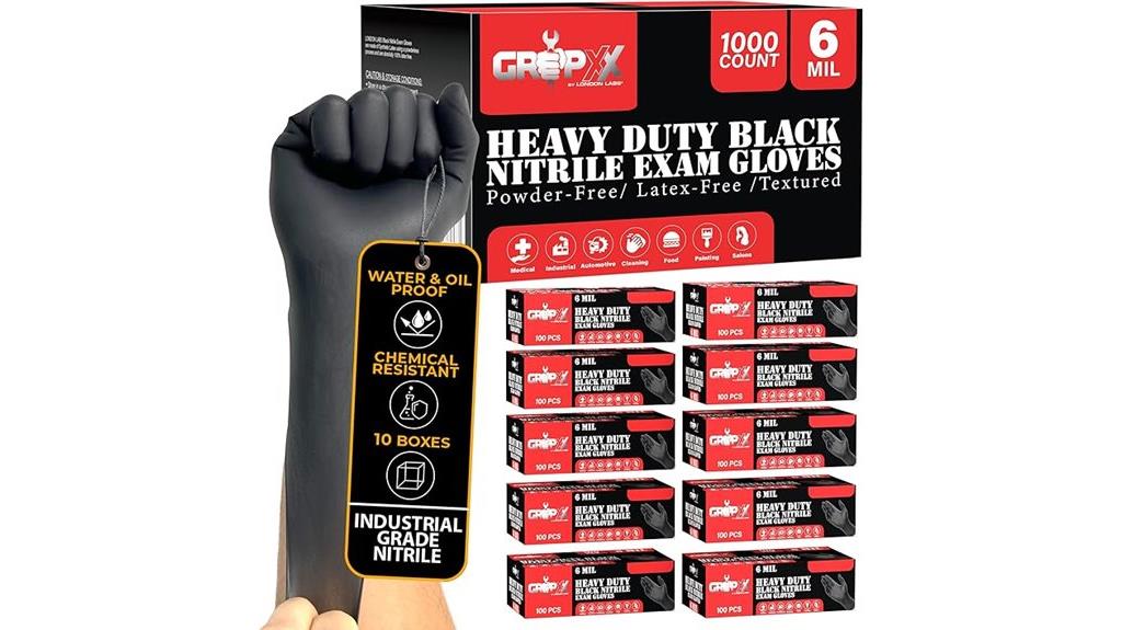 For those tackling demanding tasks that require both protection and durability, the Heavy Duty Black Nitrile Gloves (1000 Pack) stand out as an excellent choice. These 6-mil gloves are thick, well-fitting, and resistant to tearing, making them perfect for jobs like working on motors, handling chemicals, or gardening. They’re powder-free, latex-free, with a smooth texture, ensuring comfort during extended wear. Many users appreciate their ability to maintain dexterity and tactile sensitivity, even when reused for non-sanitary chores. Despite their durability, they’re affordable and provide excellent value, making them a reliable, long-lasting option for tough, everyday tasks.