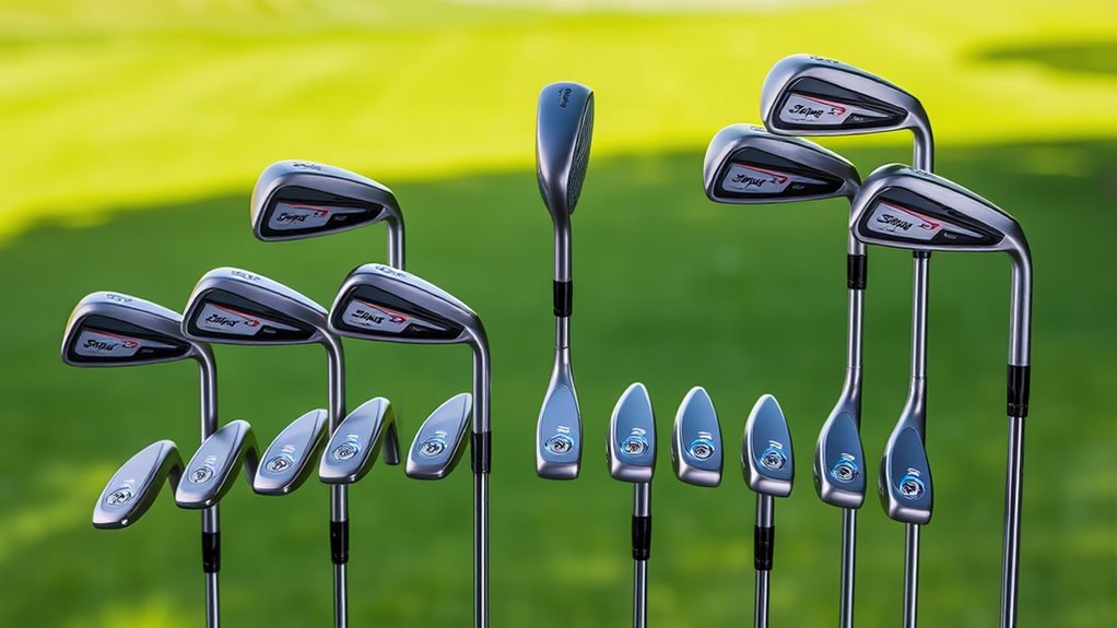 When choosing a golf set, it’s important to take into account the variety of clubs included and their range of lofts, as these factors directly impact your shot options and overall versatility. A well-rounded set typically includes a driver, fairway woods, hybrids, irons, wedges, and a putter, covering all shot types. The lofts influence shot height and distance—higher lofts produce higher, shorter shots, while lower lofts give longer, flatter shots. Sets can feature a mix of forgiving clubs for beginners and specialized clubs for advanced players, enhancing versatility. The total number of clubs varies from 8 to 14, affecting shot variety and weight. Some sets also include accessories like headcovers or bags, boosting convenience and performance across different course situations.