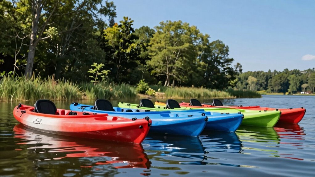 Stability and balance are essential factors for beginners selecting a hard shell kayak, as they directly impact safety and confidence on the water. A wide, flat hull increases stability by boosting contact with the water, making tipping less likely. Multi-chine hulls, with their angled edges, improve balance and provide a smoother ride in both calm and rough conditions. A lower center of gravity, achieved through seated paddling positions and smart kayak design, helps maintain stability. Longer kayaks tend to track better and are easier to control, offering added stability for novices. Additionally, features like built-in flotation and reinforced hulls enhance overall safety and balance. Choosing a kayak with these stability characteristics guarantees a more secure and enjoyable paddling experience for beginners.