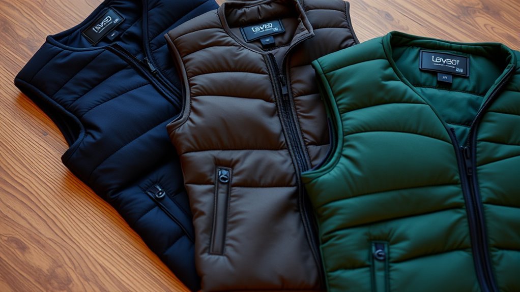 Choosing the right control and settings on a heated vest can make all the difference in staying comfortable during outdoor activities. I look for vests with multiple heating levels, usually three, so I can easily customize warmth based on my needs. An intuitive control system is essential—simple buttons or touch controls allow quick adjustments without hassle. Zone-specific controls are a bonus, letting me target heat to areas like my shoulders or back independently for personalized comfort. I also prefer digital or smart control units that offer precise temperature regulation and real-time monitoring. Durability is key; I want a control device that’s weather-resistant, portable, and reliable in various outdoor conditions. These features ensure I stay warm, comfortable, and in control, no matter the circumstances.