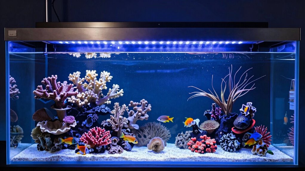 Lighting spectrums directly influence algae growth control because certain wavelengths promote or inhibit algae development. I’ve found that using lights with a balanced spectrum, especially limiting blue and red wavelengths, helps reduce unwanted algae. By adjusting the spectrum to match the needs of your aquatic life, you can effectively manage algae without harming your corals or plants. It’s all about finding that perfect balance for a healthy, clear tank.