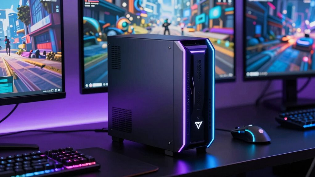 Mini PCs handle thermal management during extended gaming sessions pretty well, thanks to advanced cooling solutions like vapor chambers and high-quality fans. I’ve noticed that manufacturers optimize airflow and use smart thermal throttling to prevent overheating. While they might get warm, these systems usually balance performance and temperature effectively, ensuring you can enjoy long gaming marathons without worrying about thermal shutdowns or significant performance drops.