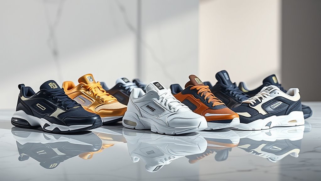 When I think about the most luxurious high-end sneakers, I notice they often use premium materials like genuine leather, exotic skins such as alligator or python, and soft suede. Designers also incorporate materials like technical mesh, reflective textiles, and even precious metals or embellishments. These elements not only elevate the style but also guarantee durability and exclusivity, making each pair a statement of craftsmanship and luxury.