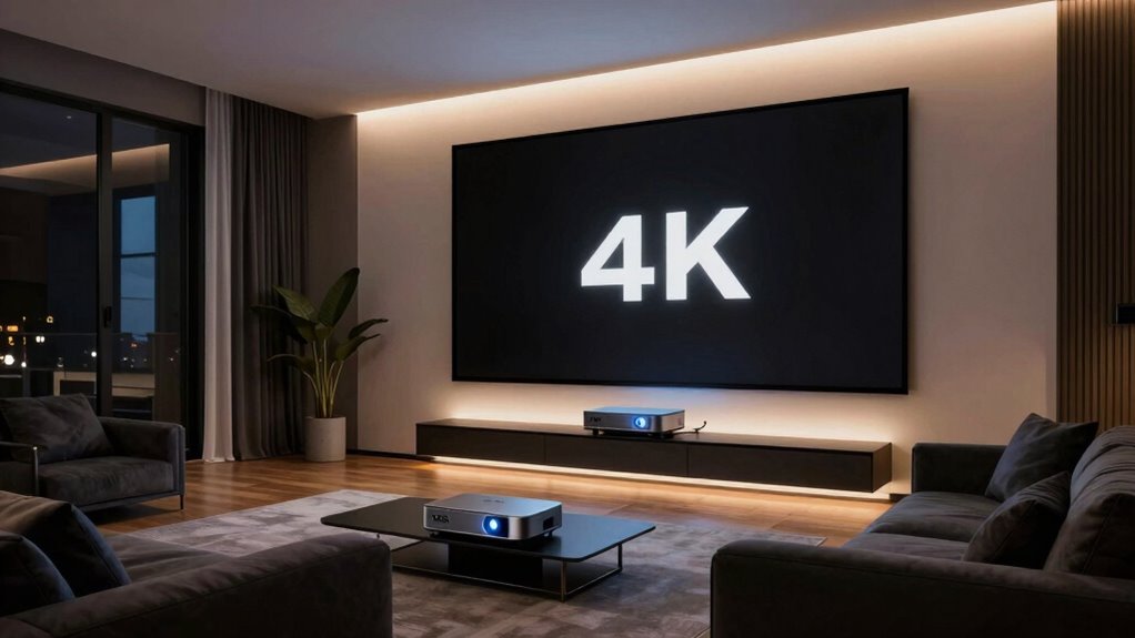 Have you ever wondered how much a higher resolution can transform your home theater experience? With 4K resolution, you’ll get four times the pixels of Full HD, making images sharper and more detailed. This means you’ll see textures and fine details clearly, creating a more immersive viewing experience. HDR further enhances this by improving contrast and color accuracy, resulting in vibrant, lifelike visuals. True 4K projectors use pixel-shifting technology or native 4K panels to deliver these high-resolution images. The quality of resolution is essential for large screens, as it maintains clarity without pixelation or blurring. Ultimately, choosing a projector with excellent resolution quality guarantees your movies and shows look stunning, providing clarity and realism that elevate your home theater setup.
