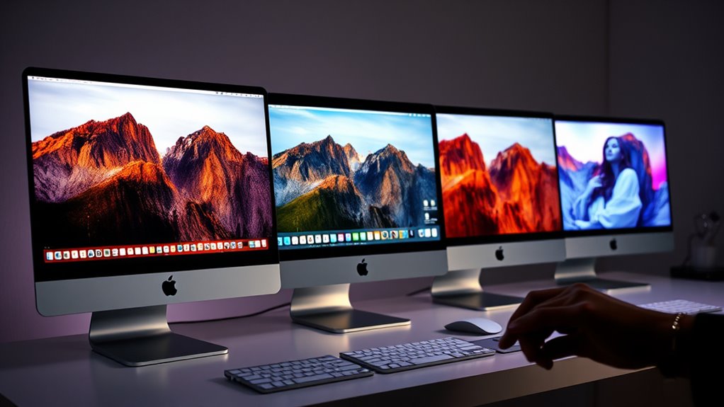 If you’re searching for the best iMacs for stunning photo editing in 2025, I recommend focusing on models with the latest M4 chip, a vibrant 4.5K Retina display, and excellent color accuracy. The new all-in-one design offers powerful processing, ample storage, and impressive visuals that make editing smooth and precise. To find the top picks that suit your needs and budget, keep going—I’ll share all the details next.