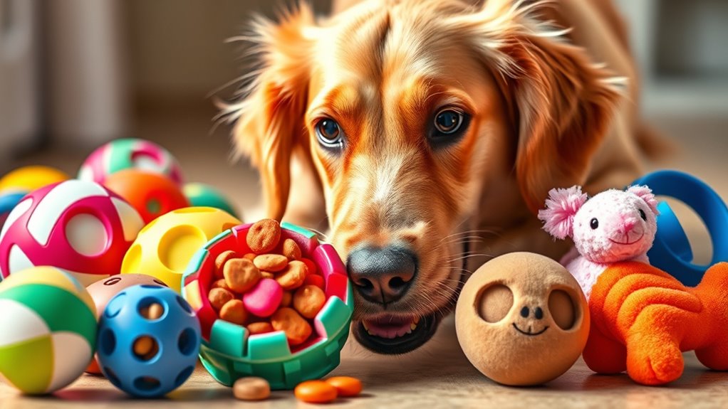 If you’re looking for the best interactive dog toys to keep your furry friend engaged and happy, I’ve found some great options. From motion-activated rolling balls to treat puzzles and squeaky tug toys, these toys promote mental stimulation, physical activity, and reduce boredom. Using durable materials and safety features, they suit different play styles and sizes. Keep watching to discover some top-rated toys that will make playtime fun and safe for your dog.
